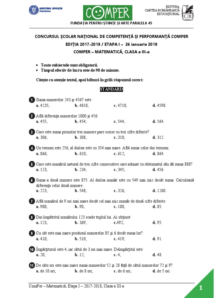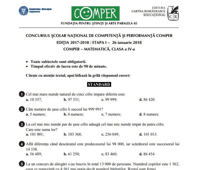 Etapa i a concursului comper 2017 are loc pe 20 ianuarie la disciplina comunicare si pe 27 ianuarie la matematica. Limba engleza pentru clasa pregatitoare 2017. Matematica si explorarea mediului pentru clasa pregatitoare.