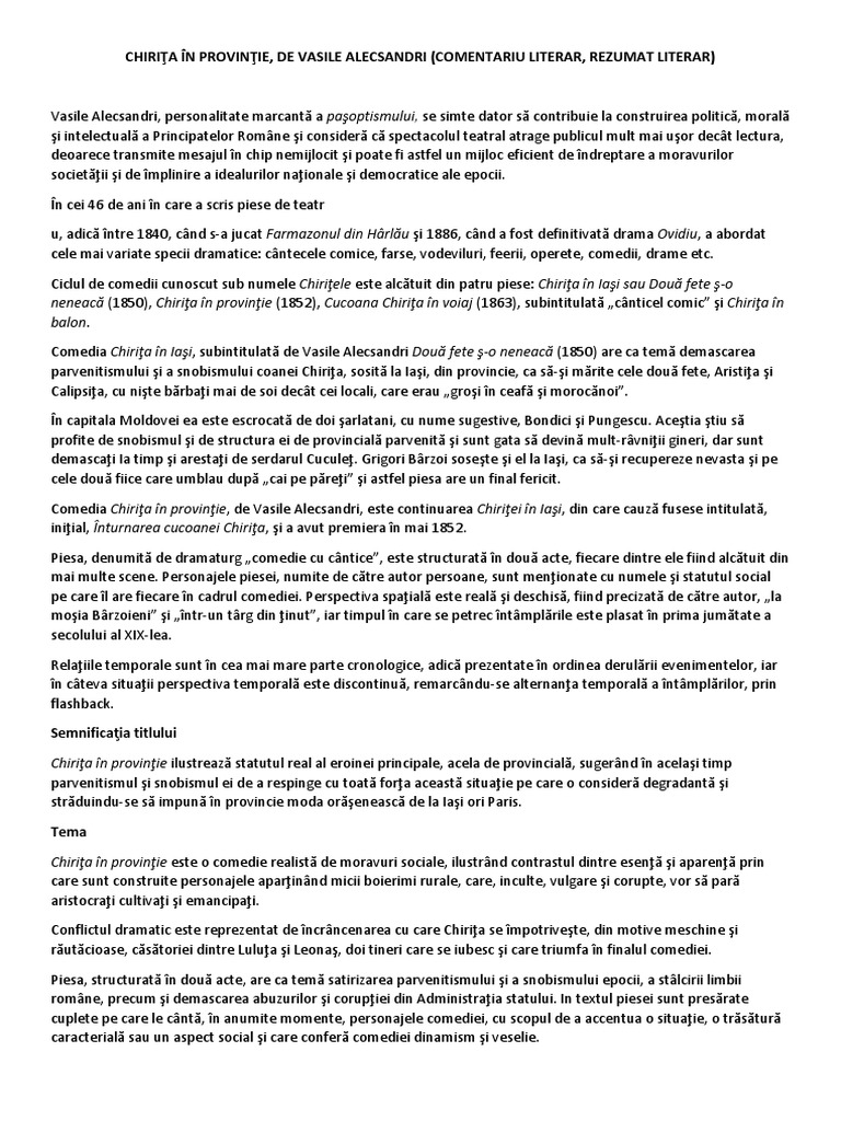 40/100/150 coana chirita ot barzoieni mai răstoarnă un cuptor de plăcinte, dă cep la un butoi de vin și vă poftește iar la bal. Vasile alecsandri chirita in provintie tema si viziunea despre lume cel mai reprezentativ poet al unei frimantate epoci din istoria poporului nostru, vasile alecsandri a ilustrat literatura noastré timp de aproape jumatate de veac. Subiectul este comic şi critică opera chirita in provintie se incadreaza in specia comediei, deoarce autorul satirizeaza cu.