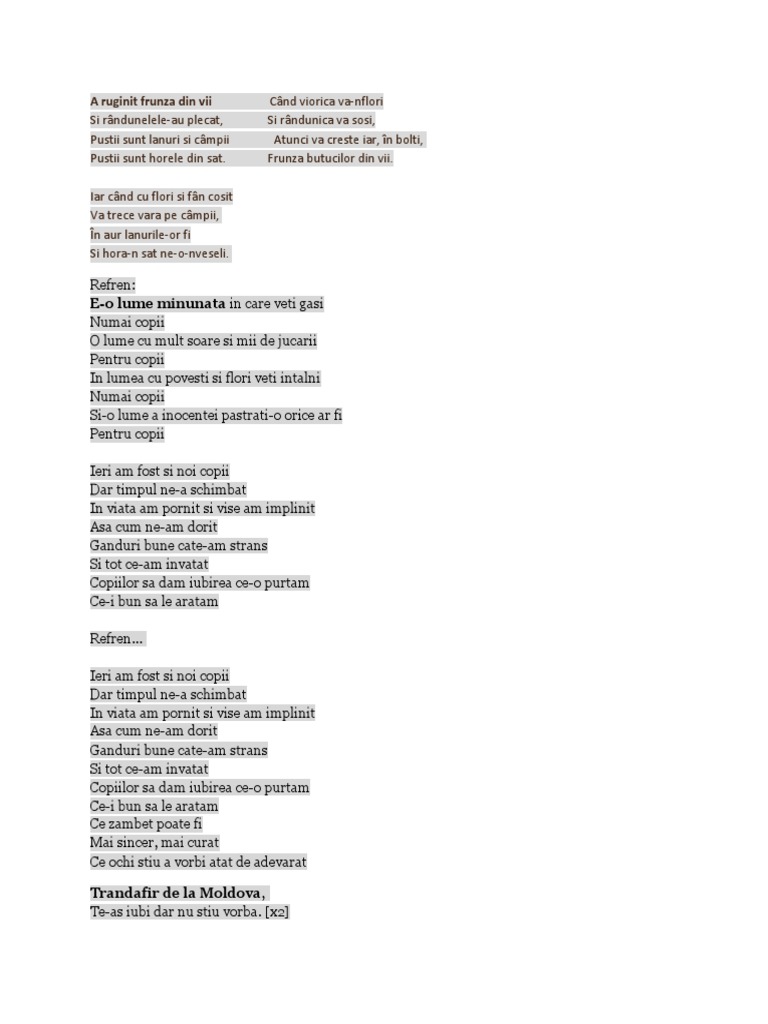 Dimineata e cam subtire tricoul si ziua intra la apa. A ruginit frunza din vii. Va treca vara pe campii.